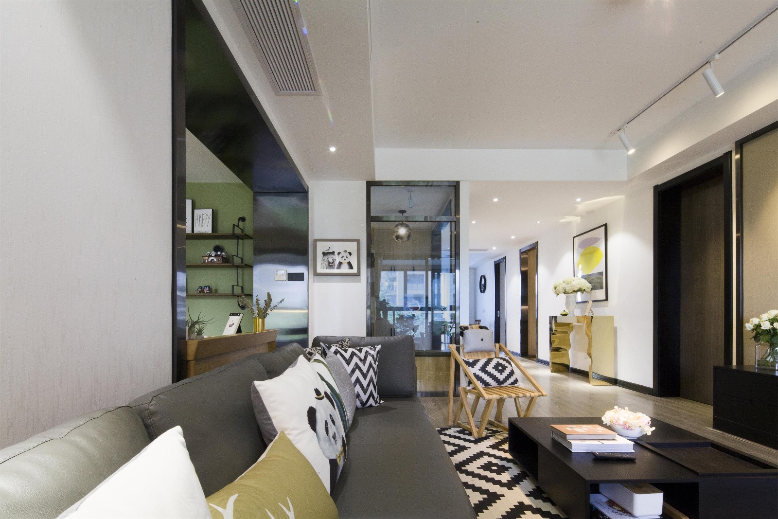 客廳后面是敞開(kāi)式書(shū)房,出挑的黃色沙發(fā)為空間帶來(lái)一抹亮色,