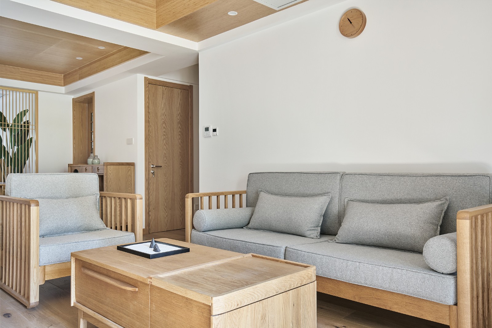 簡單的灰色系布藝沙發,端重卻不失靈動,自然的背景墻掛上實木小時鐘