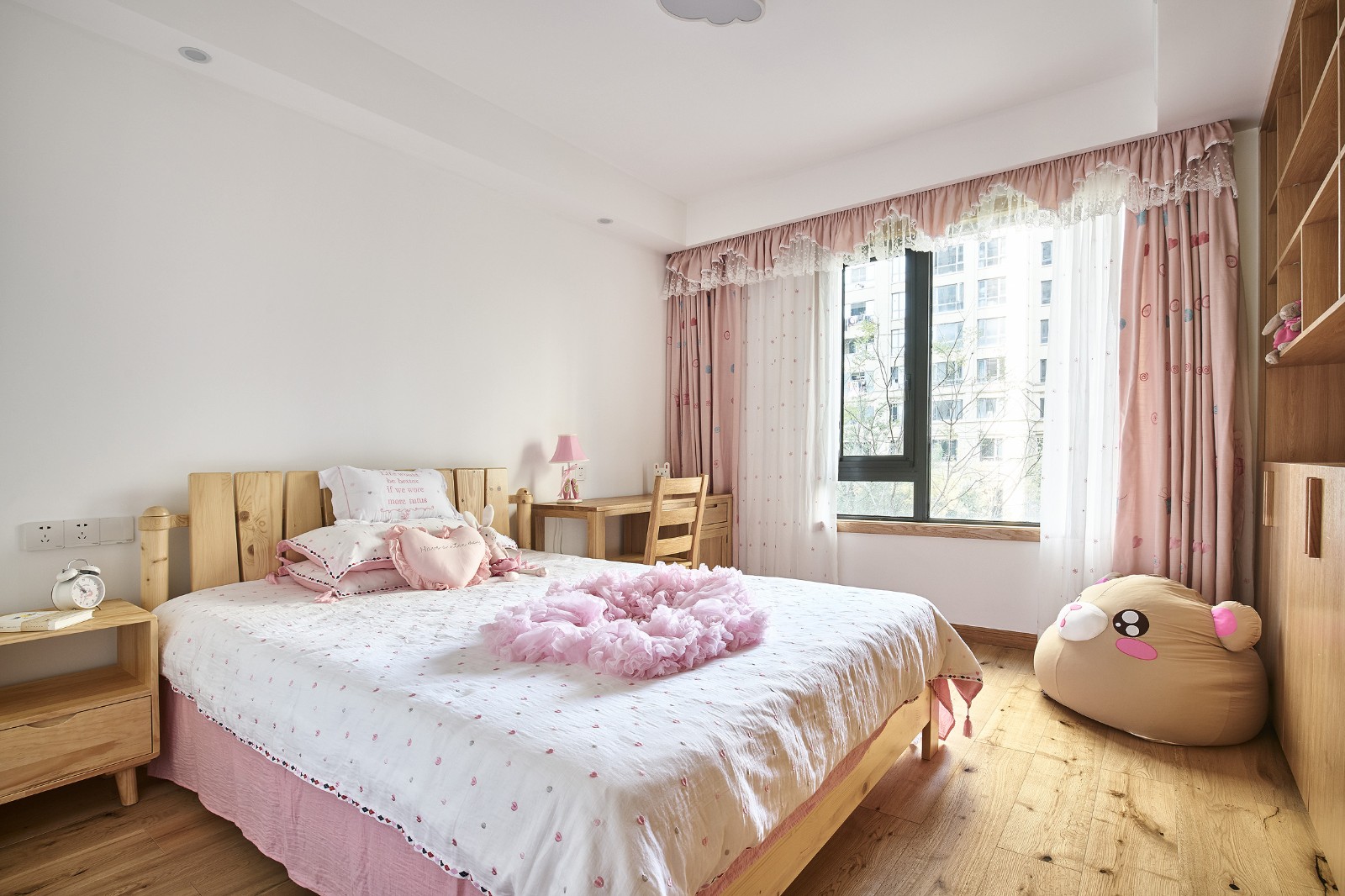 粉色的公主城堡,房間主體部分仍是原木色,易變更部分如床品窗簾,可以根據小朋友的喜好更換。