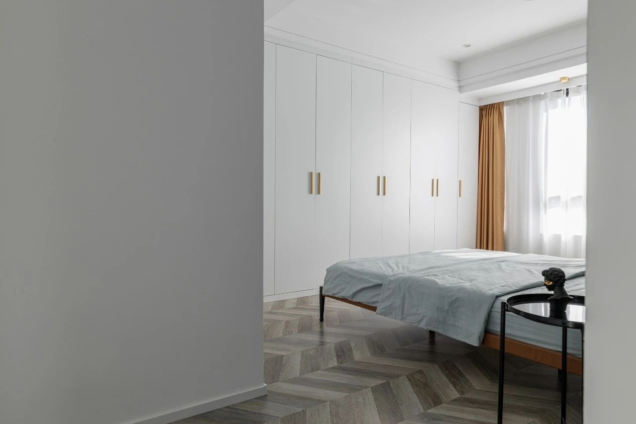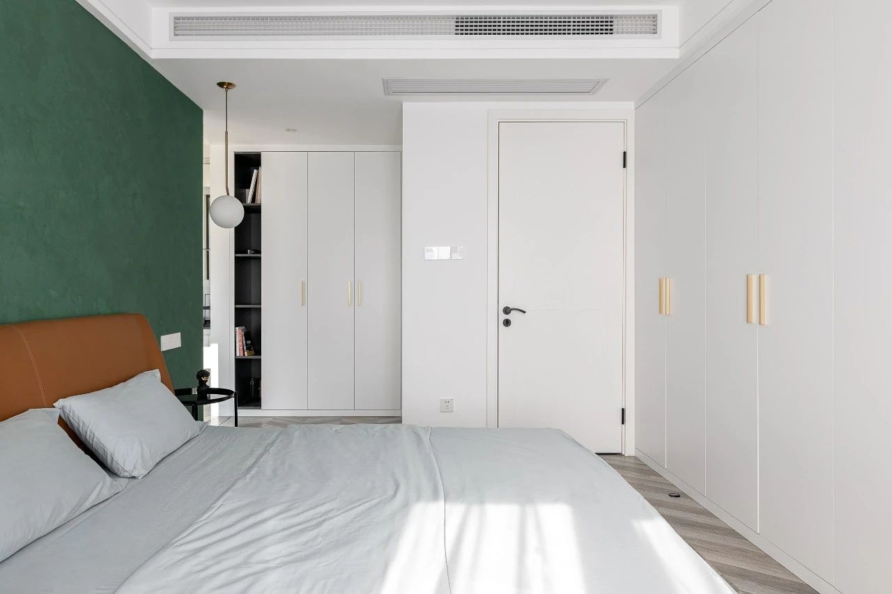 主臥的設計也延用了公共空間的配色,墨綠色作為床頭背景色,搭配黃色的皮革床,營造出低調高雅的氣質。
