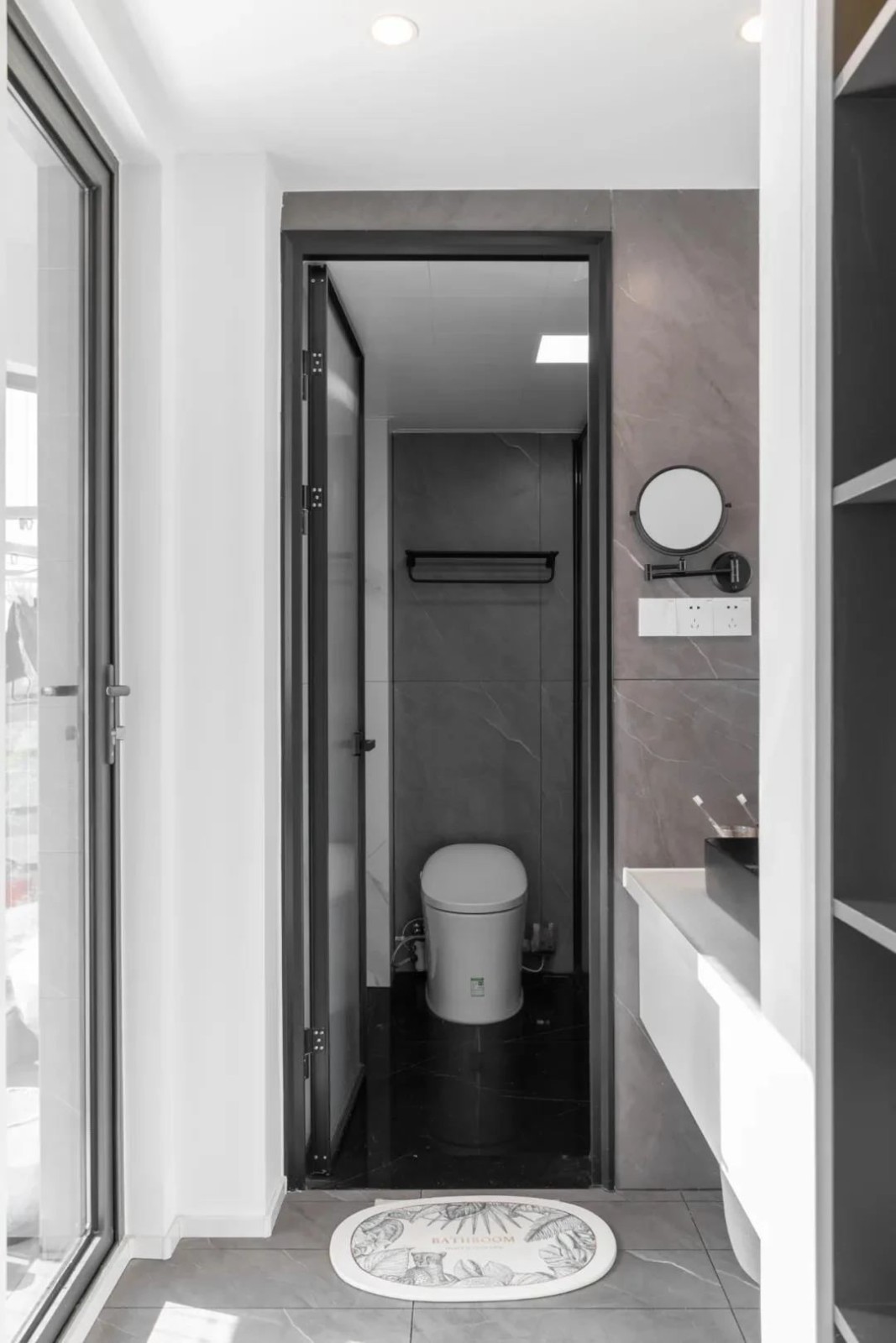 衛生間與小陽臺之間用玻璃門分隔,增加暗衛的采光和通透性。